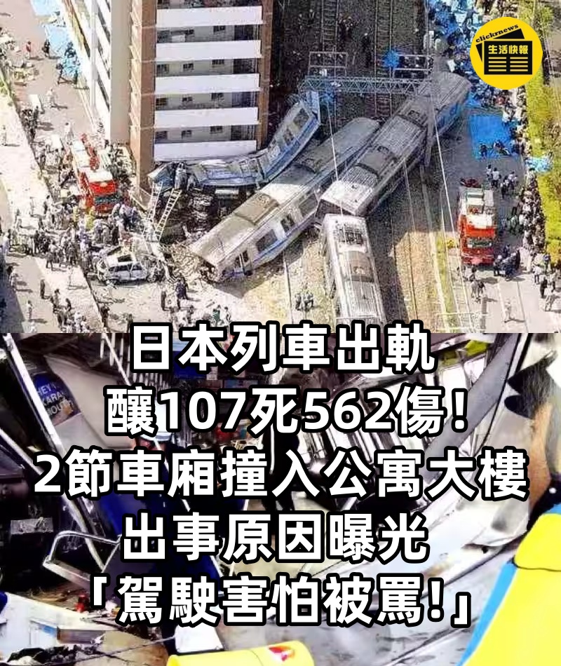 1/6 日本列車出軌釀107死562傷!2節車廂「撞入公寓大樓」 出事原因曝光「駕駛害怕被罵!」 日本列車出軌釀107死562傷!2節車廂「撞入公寓大樓」 出事原因曝光「駕駛害怕被罵」 根據《ETtoday新聞雲》報導,2005年日本JR西日本福知山線發生重大列車出軌意外,造成10