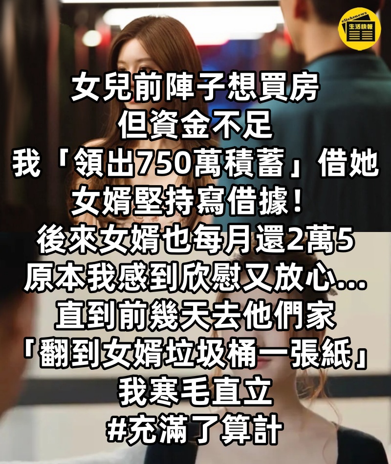 女兒前陣子想買房但資金不足,我「領出750萬積蓄」借她,女婿堅持寫借據!後來女婿也每月還2萬5,原本我感到欣慰又放心...直到前幾天去他們家「翻到女婿垃圾桶一張紙」我寒毛直立 #充滿了算計
