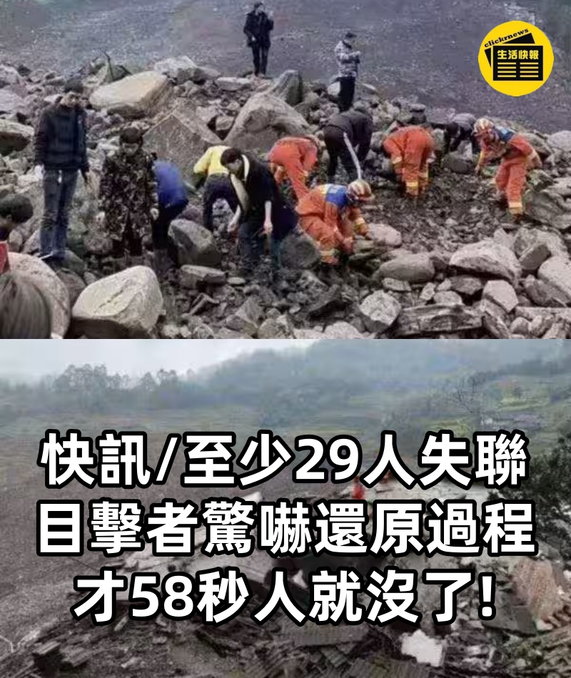 1/6 快訊/至少29人失聯 !目擊者驚嚇還原過程:「才58秒人就沒了」 至少29人失聯! 目擊者驚嚇還原過程:「才58秒人就沒了.....」 四川省宜賓市筠連縣沐愛鎮金坪村於2月8日11時50分左右發生大規模山崩,導致多棟民宅被掩埋,造成29人失聯。