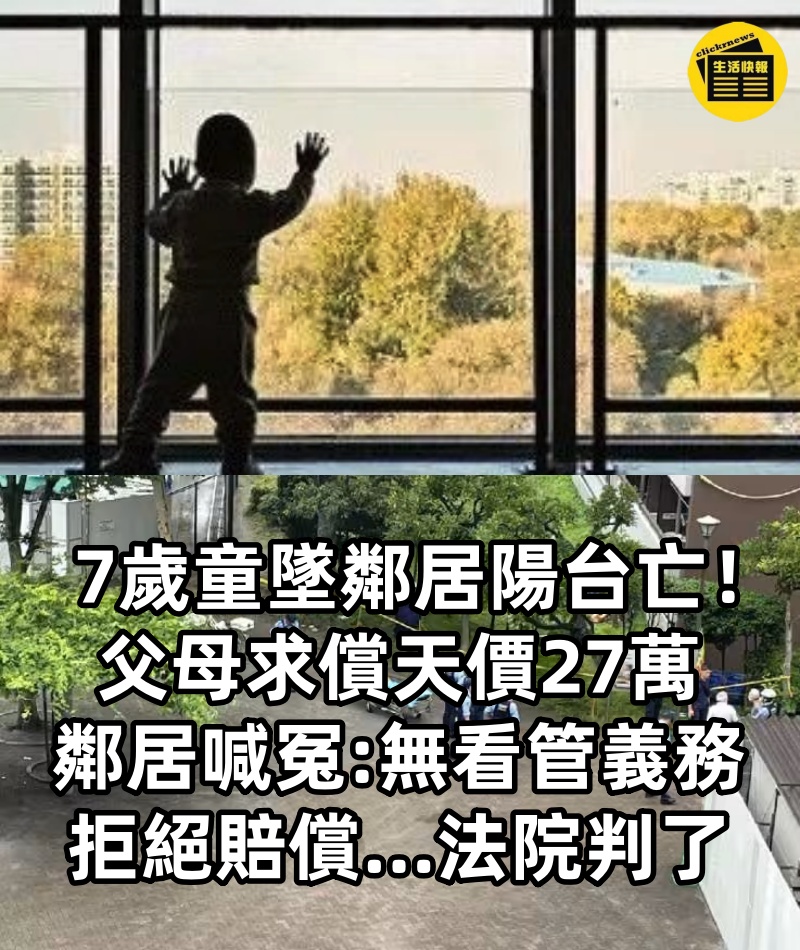 7歲童墜鄰居陽台亡!!父母求償天價27萬,鄰居喊冤「無看管義務」拒絕賠償...法院判了