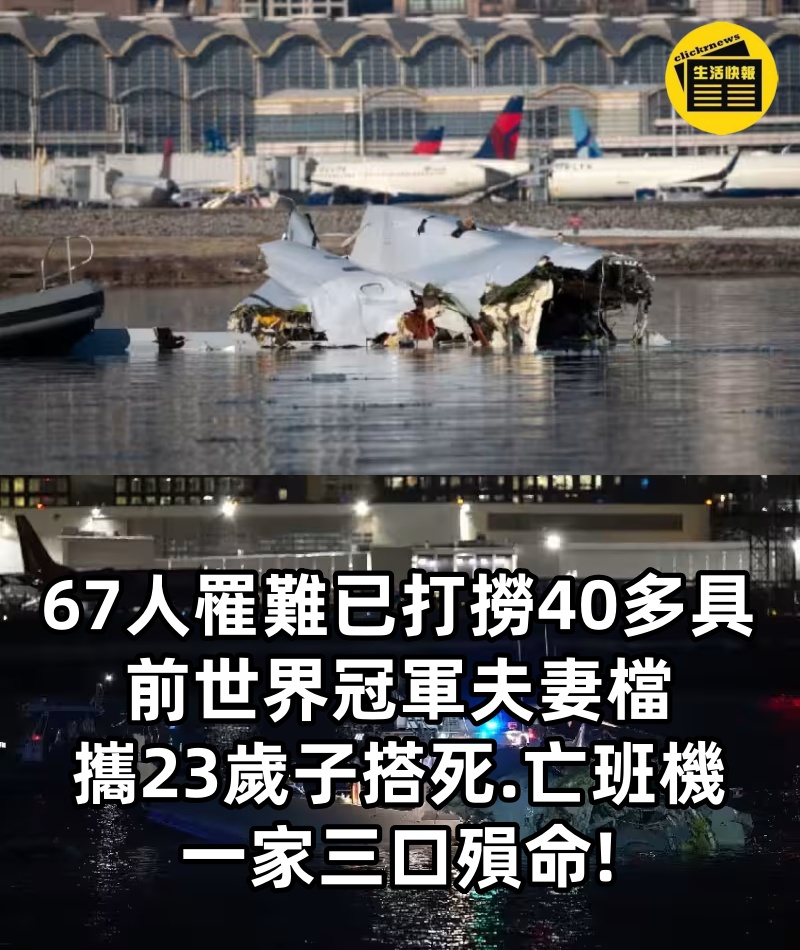 1/5 67人罹難「已打撈40多具」!「前世界冠軍夫妻檔」攜23歲子搭死亡班機 一家三口殞命 日前才剛發生濟州空難令人心痛,不料不料29日晚間又發生一起震驚美國的重大空難意外,一架載有64人的美國航空客機,與載有3人的軍方黑鷹直升機相撞,兩架飛機雙雙墜入波多馬克河(Potomac Riv