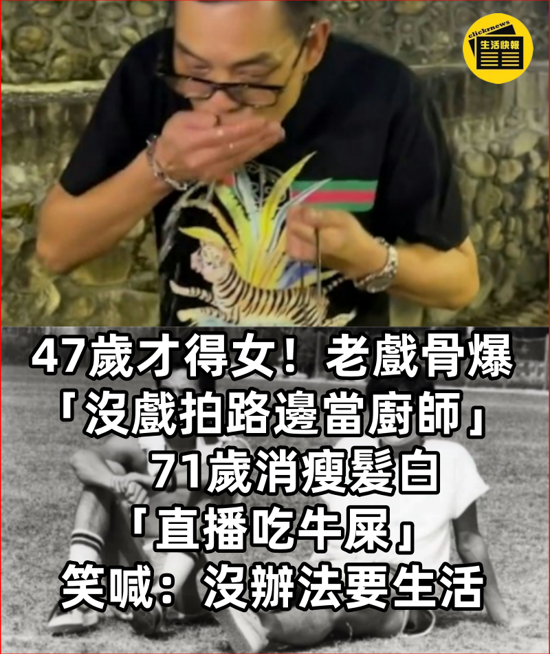 47歲才得女!老戲骨爆「沒戲拍路邊當廚師」 71歲消瘦髮白「直播吃牛屎」笑喊:沒辦法要生活