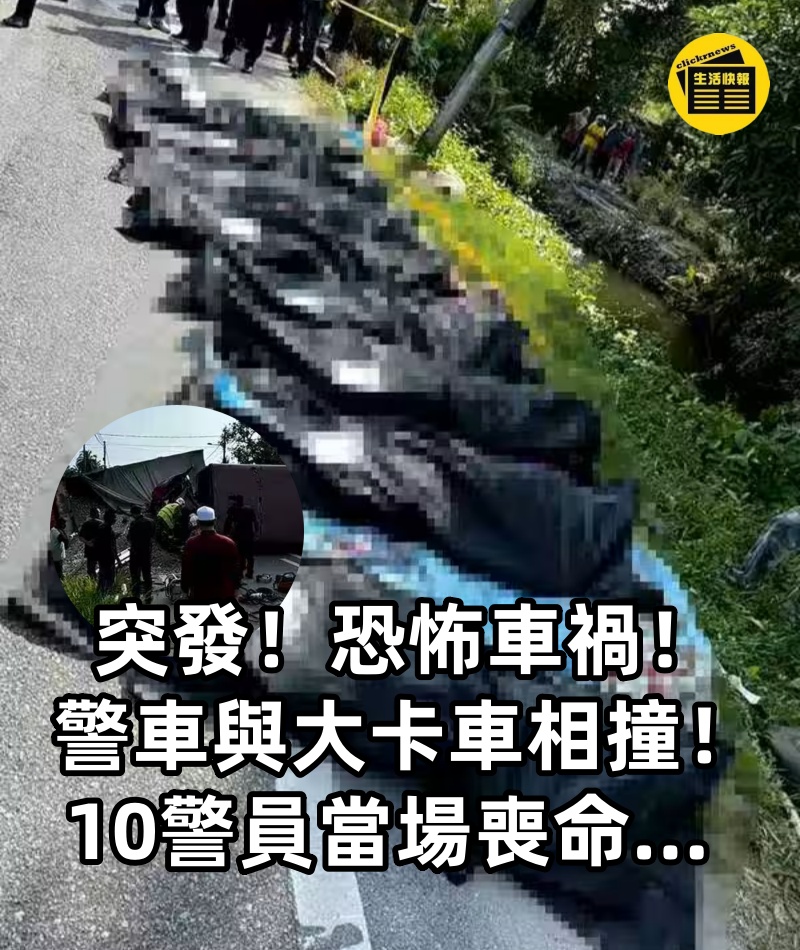 1/3 突發!恐怖車禍!警車與大卡車相撞! 10警員當場喪命... 聯邦後備隊返回途中發生嚴重車禍,已造成10人罹難 (馬來西亞怡保13日訊)一輛載有聯邦後備隊員的羅厘在返回怡保途中,與一輛載沙石的羅厘迎面相撞,造成傷亡慘重。 截至目前,死亡人數已增至10人。