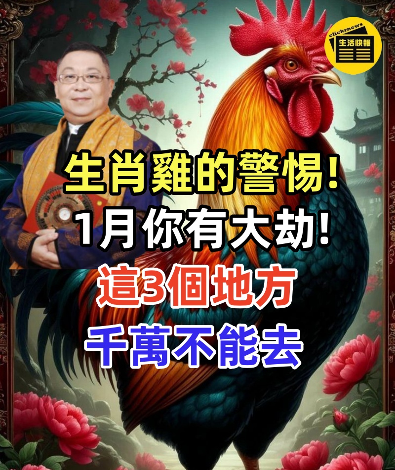 1/6 生肖雞警惕!1月你有大劫!這3個地方千萬不能去!屬雞人必知!2026年1月,生肖雞的朋友命宮將遭遇「火克金」的強力衝擊,這是十年難遇的「劫煞」格局。 酉雞屬金,碰上丙午馬年旺火,本就運勢動盪,而1月水汽封藏,水火夾攻之下,財帛宮與健康宮同時亮紅燈。 命理大師鄭重警告:這個月