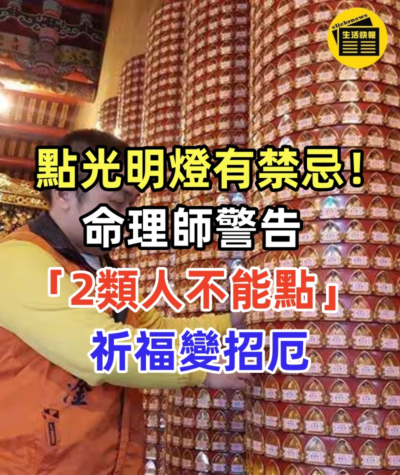 1/5 點光明燈有禁忌!命理師警告「2類人不能點」:祈福變招厄 農曆新年腳步將近,許多宮廟在元旦前便開放登記點燈服務,吸引大批信眾搶著安太歲、點光明燈祈求來年平安順遂。 不過根據《ETtoday新聞雲》報導,命理老師楊登嵙提醒,並非所有物件都適合點光明燈,有兩類人若點了恐怕無效,甚