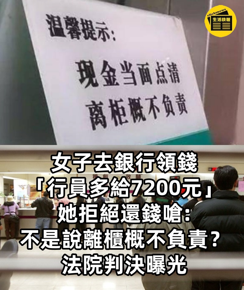 女子去銀行領錢「行員多給7200元」 她拒絕還錢嗆「不是說離櫃概不負責?」法院判決曝光