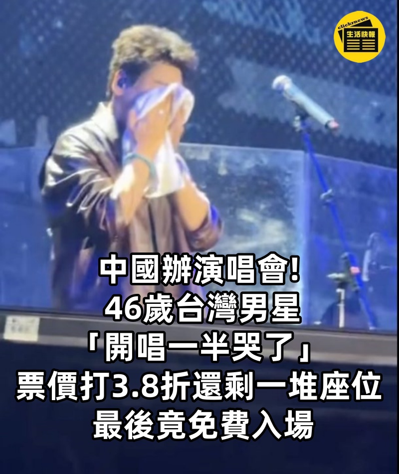 中國辦演唱會!!! 46歲台灣男星「開唱一半哭了」票價打3.8折「還剩一堆座位」 最後竟免費入場