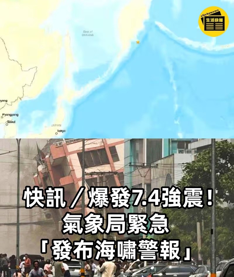 1/3 快訊/爆發7.4強震! 氣象局緊急 「發布海嘯警報」 根據《ETtoday新聞雲》報導,俄羅斯堪察加半島海域接連發生強烈地震,震盪範圍廣大。 當地時間20日,該區域先是遭遇規模6.7地震襲擊,沒想到隨後又發生更強烈的規模7.4地震。 2/3