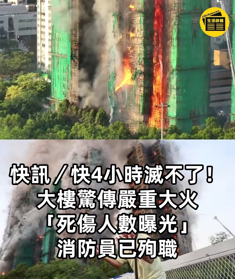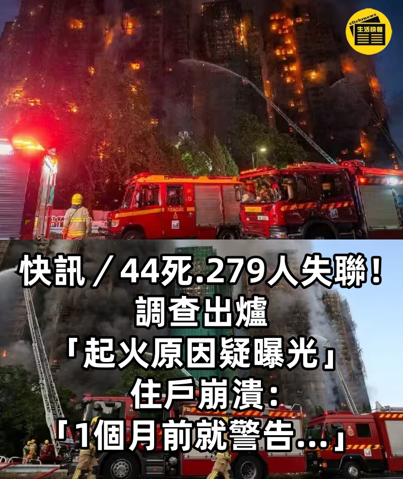 1/3 根據《TVBS新聞網》報導,香港大埔「宏福苑」社區昨日下午驚傳嚴重火警,多棟建築遭烈焰吞噬,截至今日清晨火勢仍持續悶燒,已造成至少44人喪生、279人下落不明。 諷刺的是,該社區居民早在一個月前就曾在網絡上討論過維修工程可能帶來的火災隱憂,如今竟不幸應驗。