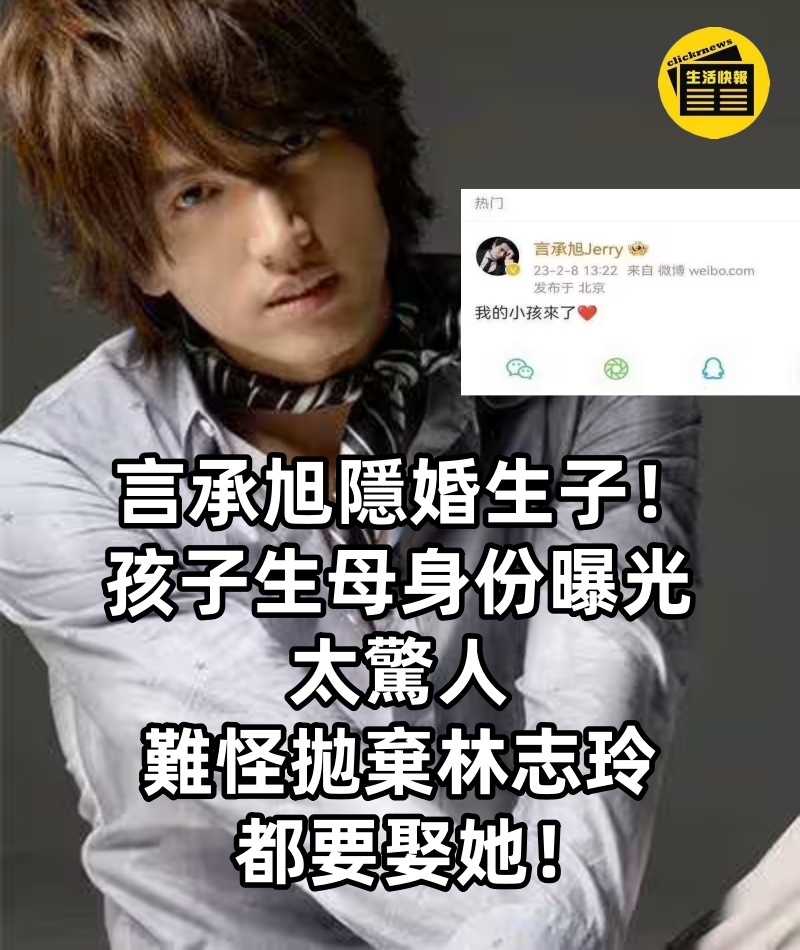 1/5 言承旭隱婚生子!孩子生母身份曝光太驚人,難怪拋棄林志玲都要娶她! 言承旭在個人社交平台發布:我的小孩來了。 不少網友誤以為言承旭也像胡歌這樣,突然爆出有孩子的消息, 於是有人送上祝福,有人在好奇他的老婆是誰? 引髮網友關注。