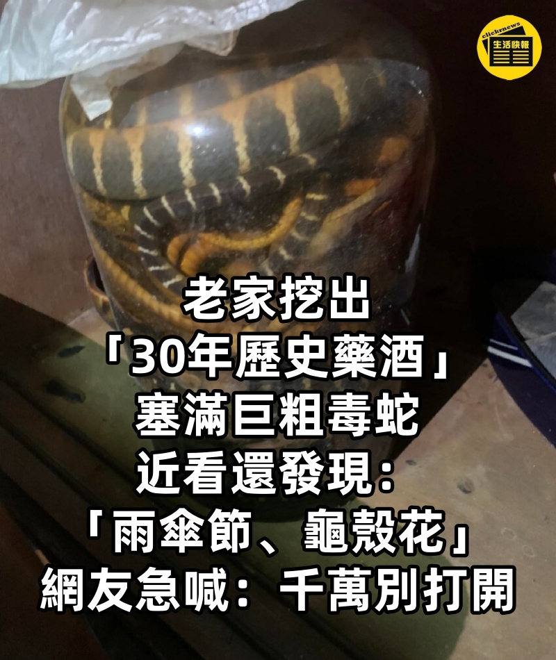 老家挖出「30年歷史藥酒」塞滿巨粗毒蛇 近看還發現「雨傘節、龜殼花」網友急喊:千萬別打開