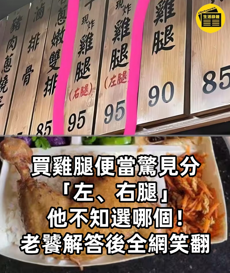 1/3 一名網友日前到一家便當店買午餐,結果在點餐時被店裡的菜單給難住了。只見菜單上清楚寫著「傳統現炸雞腿(左腿)」和「古早現炸雞腿(右腿)」,價錢還一模一樣。他看了半天,忍不住問老闆:「這是要怎麼選?左腿跟右腿吃起來有不一樣嗎?」 2/3 老闆一聽,先