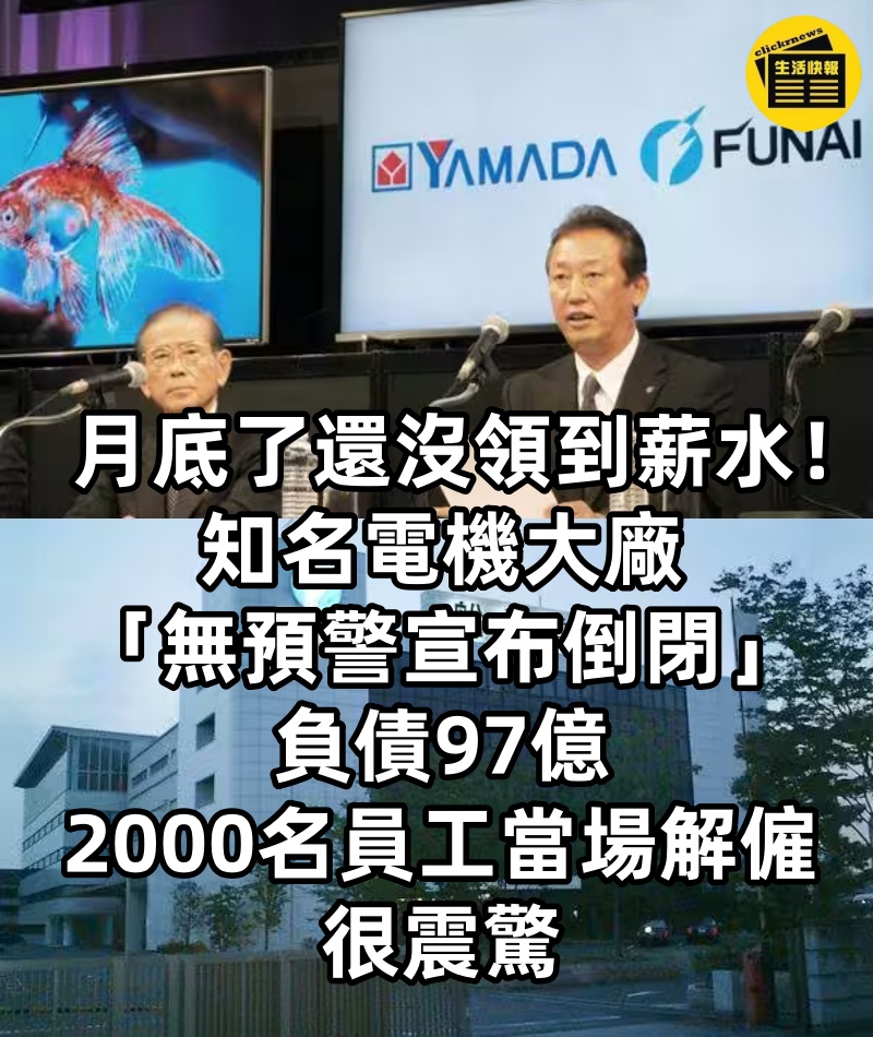 1/3 經濟不景氣,近期多傳出許多知名大公司突如其來倒閉的消息,(10/26)又傳出知名電器大廠倒閉,甚至許多員工在(25日)發薪日時都沒拿到薪水,2000名員工無預警被解僱! 據《ettoday新聞雲》報導,日本電器大廠「船井電機」最近因財務問題和管理混亂宣布破產,24日的緊急說明會上