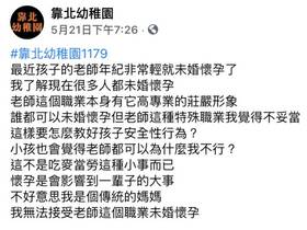 日前有一名媽媽在粉絲專頁《靠北幼稚園 》上投稿,她表示自己無法接受孩子的幼兒園老師年紀很輕且未婚懷孕,她說明雖然了解現在很多人都未婚懷孕,已經是社會上的常態,但是她認為「老師這個職業本身有高專業的莊嚴形象」,誰都可以未婚懷孕,唯獨老師這個職業未婚懷孕,便不能接受。