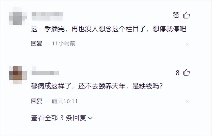 也有網友覺得黃磊太可憐了,就是有錢也買不到健康!而且都病成這樣了,不頤養天年,還來上節目,這一季沒有了吃吃喝喝、鍋碗瓢盆和農耕勞作,就感覺整個節目都失去了靈魂。
