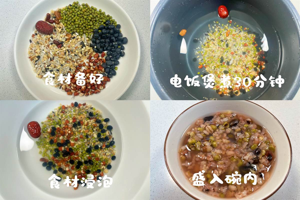 2. 同樣,紅小豆、黑豆、綠豆和薏米最好提前浸泡1-2小時。大米淘洗干凈即可。