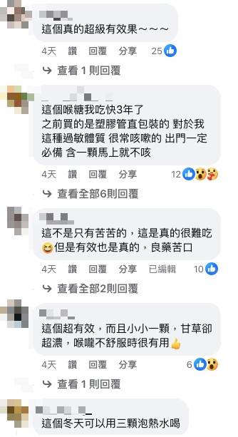 這個無糖的吃了不會有痰,我也買過送朋友吃,覺得認真是好東西」、「這個喉糖我吃快3年了!之前買的是塑膠管直包裝的,對于我這種過敏體質,很常咳嗽的,出門一定必備,含一顆馬上就不咳」、「這個超有效,而且小小一顆,甘草卻超濃,喉嚨不舒服時很有用」、「推,這個真的能舒緩咳嗽」、「我之前狂咳含進去不用30秒就不咳了」。
