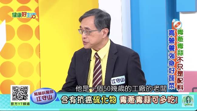 吃對食物,絕對有機會延年益壽!腎臟科醫師江守山在節目《健康好生活》分享,一名50多歲的男病患,是位工廠老闆,因為需要應酬喝酒,所以罹患食道癌,之後又因為化療導致腎臟受損,自己便向他建議「多吃蔥」,數年過去,癌癥竟完全沒復發!