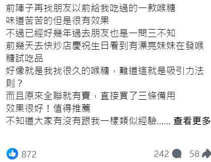 原PO表示,好幾年前友人曾給自己一款喉糖,味道苦苦的、但很有效,近期想自行購買,但忘記名字,朋友也一問三不知。然而,原PO前幾天在某間餐廳用餐,看到有漂亮妹妹在發喉糖試吃品,「好像就是我找很久的喉糖,難道這就是吸引力法則?」