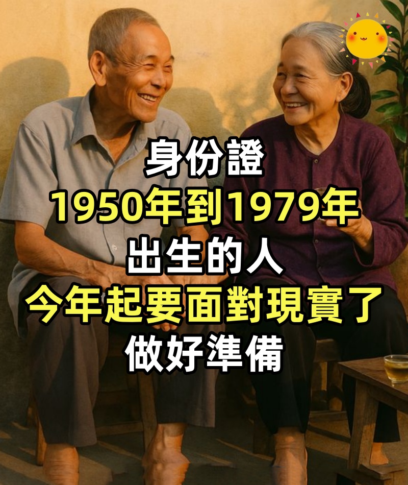 1/5 身份證1950年到1979年出生的人,明年起要面對現實了!做好準備 隨著高齡化社會加速到來,台灣的人口結構正在快速改變,養老、 就業與社會保障問題,也成為近年最受關注的焦點之一。 專家提醒,身份證出生年落在1950年至1979年間的族群,從明年開始, 將更明顯感