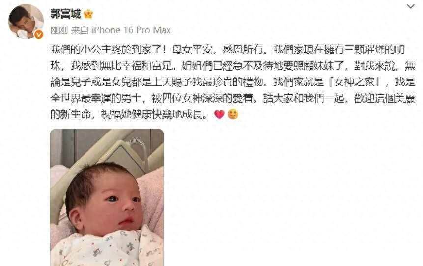 10 月 22 號郭富城在社交平台官宣三胎出生啦,說 「我們的小公主終于到家了!母女平安,感恩所有。現在家里有三顆璀璨的明珠,我太幸福滿足了。姐姐們都急著要照顧妹妹,不管是兒子還是女兒,都是上天給我的珍貴禮物。」 你看照片里小 baby 那眼睛,清澈又明亮,顧盼生輝的,太有神了!這顏值,真的絕了!再看他另外兩個女兒,小頭小臉的,一看就是美人坯子,臉型流暢、鼻子精致,輪廓還帶點混血味,關鍵是沒什麼顏值尷尬期,頜面頭型都沒死角,郭富城這妥妥人生贏家啊!