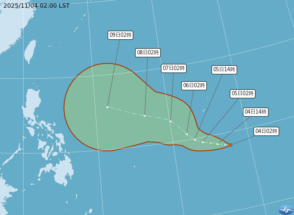 中央氣象署預報人員蔡伊其受訪時說明,預計本周三有機會轉變為颱風,初期將以西北西的方向移動,周末到下周會抵達呂宋島東側海面,而後續路徑的分歧程度相當大,有些預測路徑是比較直接衝擊台灣,有些則是較早北轉往琉球方向,也有些會進入南海,是否會直接影響台灣還需要再觀察,但下周二前後會比較接近台灣。