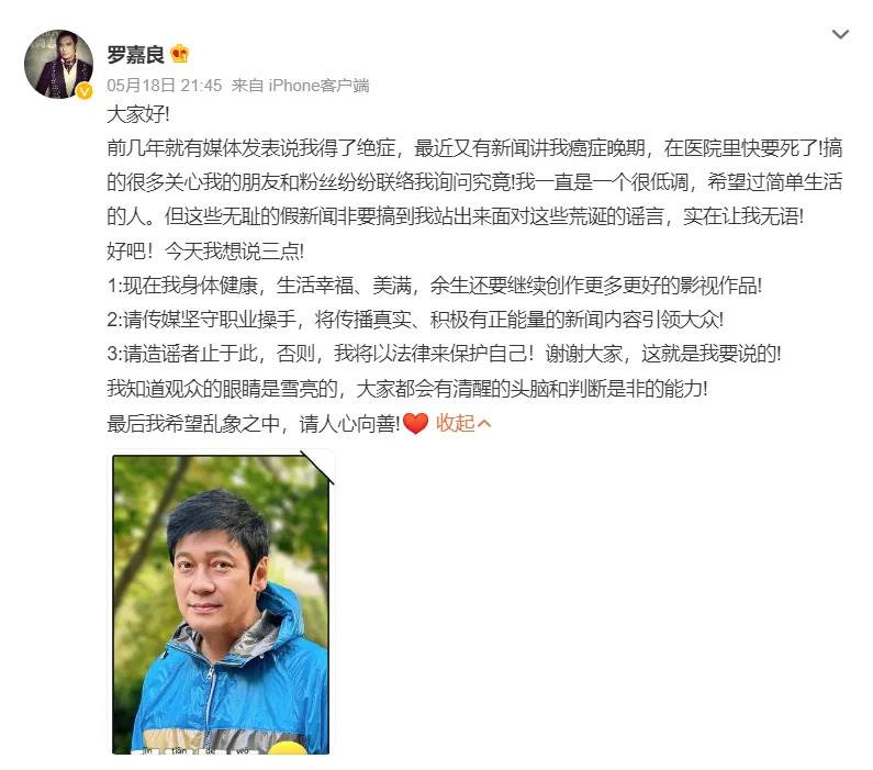 事實上,羅嘉良在2009年與同為女星的蘇巖二婚後,育有一個寶貝女兒名叫sela,現在已經10歲了,為了給年幼的女兒一個好的環境,羅嘉良年過花甲仍忙碌地拍戲賺錢,去年還被爆出已經癌末,在醫院已經進入垂死狀態,不過他馬上就在微博發表3點聲明,鄭重否認傳聞,澄清自己身體健康、家庭幸福,並希望網友在這亂象之中能夠「人心向善」,停止造謠。