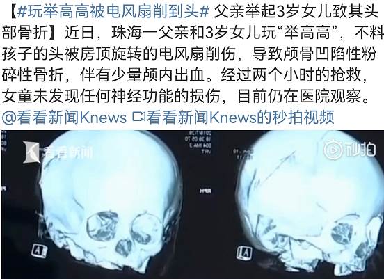 這類悲劇并不鮮見,2021年,江蘇一位父親在超市里同樣和孩子玩「舉高高」,孩子落地后哭了一會兒就睡著了,一覺醒來出現嘔吐、昏迷,被送醫后確診為顱內出血,后續住院40多天才逐漸恢復意識。