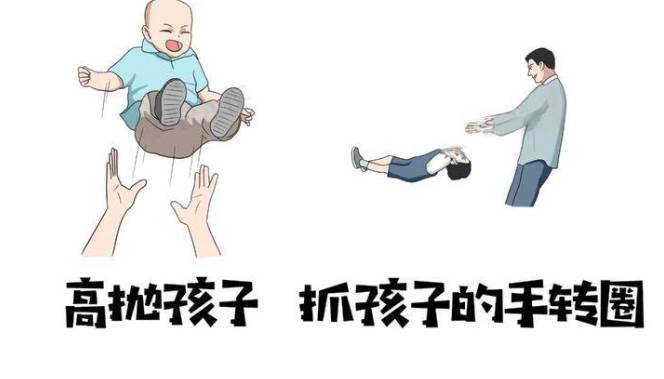 除了「舉高高」,還有類似的風險動作,比如讓嬰兒趴在肩膀上突然起跳、單手拎起孩子的手臂旋轉、用力拋接、騎脖子奔跑等等,這些行為都極容易造成關節錯位、腦震蕩或脊椎壓迫等傷害。