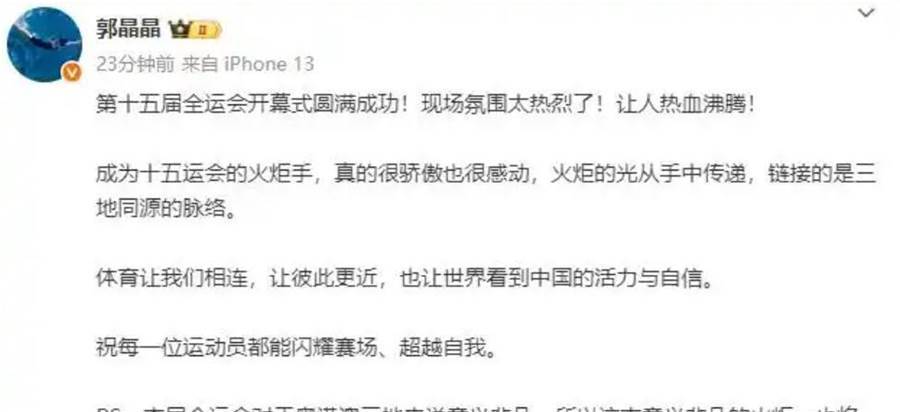 11月10日,郭晶晶還特意發文,分享自己當火炬手的心情。