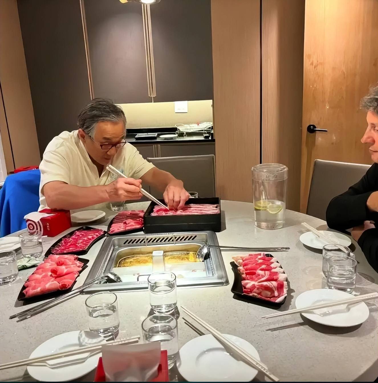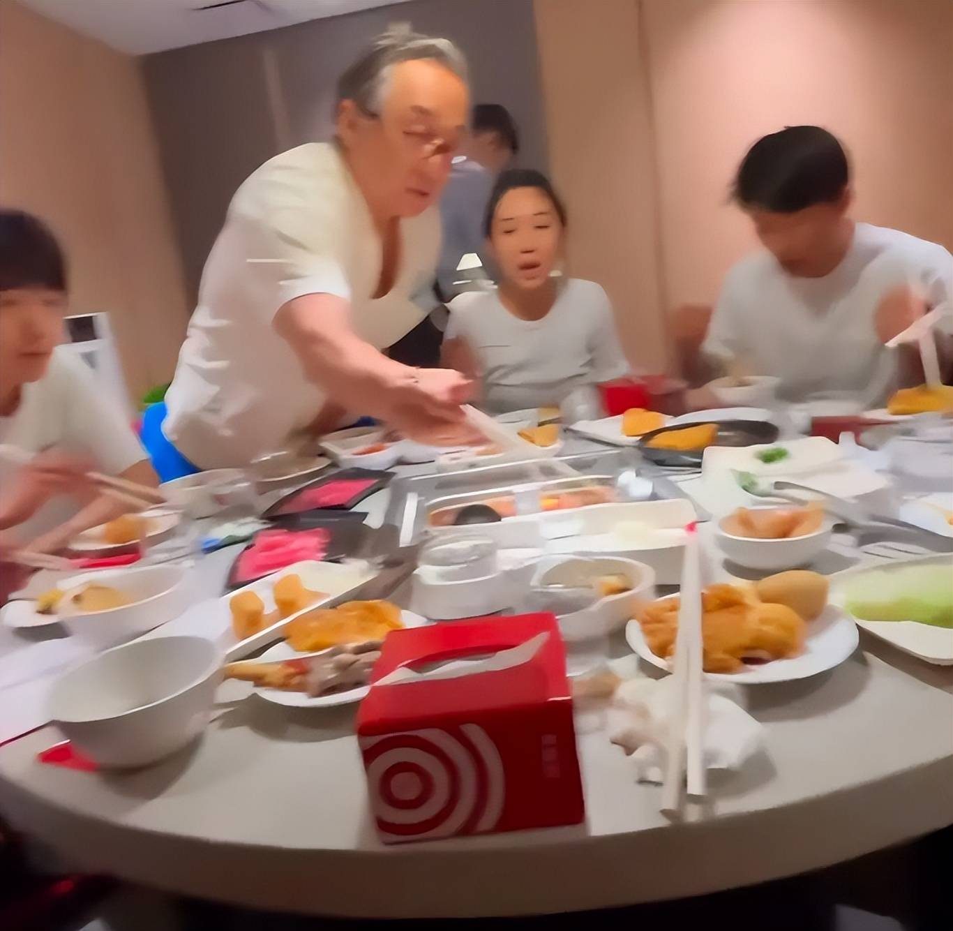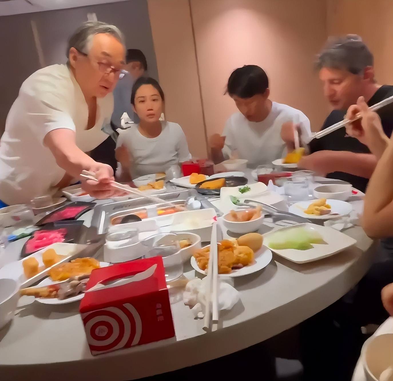 之後的成龍在加拿大餐廳吃飯被網友拍到,當天的他穿著白色襯衫,臉上戴著老花眼鏡,已經是退休老人的年齡狀態了,雖然身邊圍繞年輕人,但他仍舊親自給後輩夾菜。